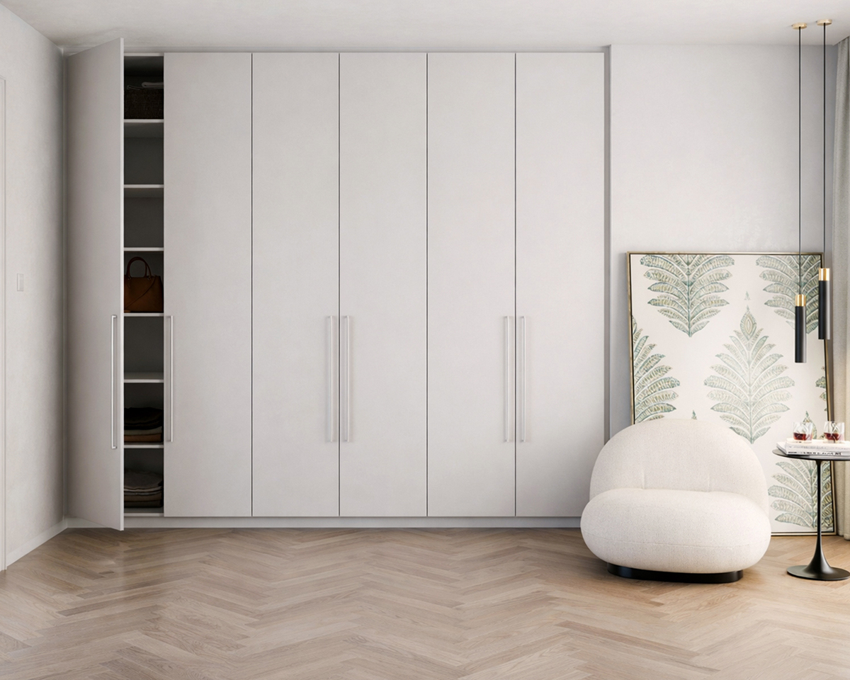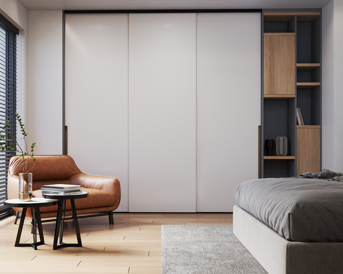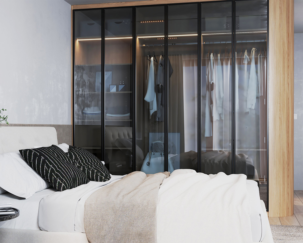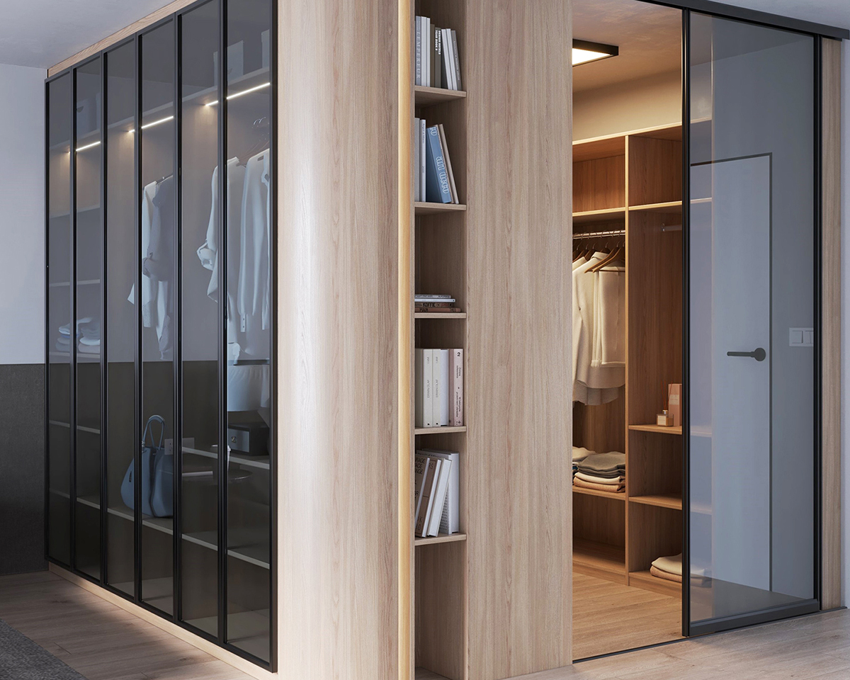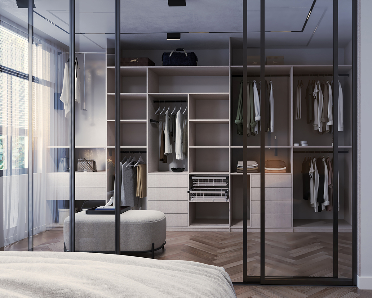 Aj v prípadoch, keď byt nedisponuje samostatnou miestnosťou, však existujú riešenia, ktoré dokážu podobný efekt dosiahnuť. Pomocou nábytkových konštrukcií je možné vytvoriť „skrytý šatník“ – oddelený úložný priestor, ktorý prirodzene nadväzuje na dispozíciu. V praxi ide napríklad o deliace steny, obojstranné riešenia alebo kombinácie s tónovanými sklami, ktoré zachovávajú vizuálnu ľahkosť a zároveň poskytujú dostatok miesta na uloženie vecí.